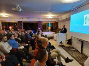 Efter maten höll Kylma AB, kvällens sponsor, en kortare presentation om bl.a. ny hemsida/e-handel, nya SCM Frigo CO2köks-booster aggregat, kommande CO2-fastighetsvärmepumpar och AERMEC nya R290-värmepump samt återvunnen glykol från Recyctec.